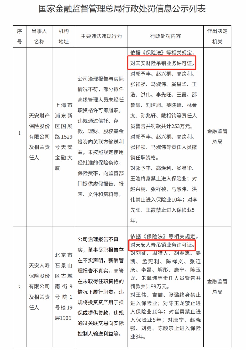 6月13日,国家金融监督管理总局官网披露行政处罚信息公式列表显示,金融监管总局对天安财险、天安人寿吊销业务许可证。同时,多名相关责任人被处以警告、罚款、撤销任职资格等,以及禁业3年、5年、10年乃至终身的梯队处罚。