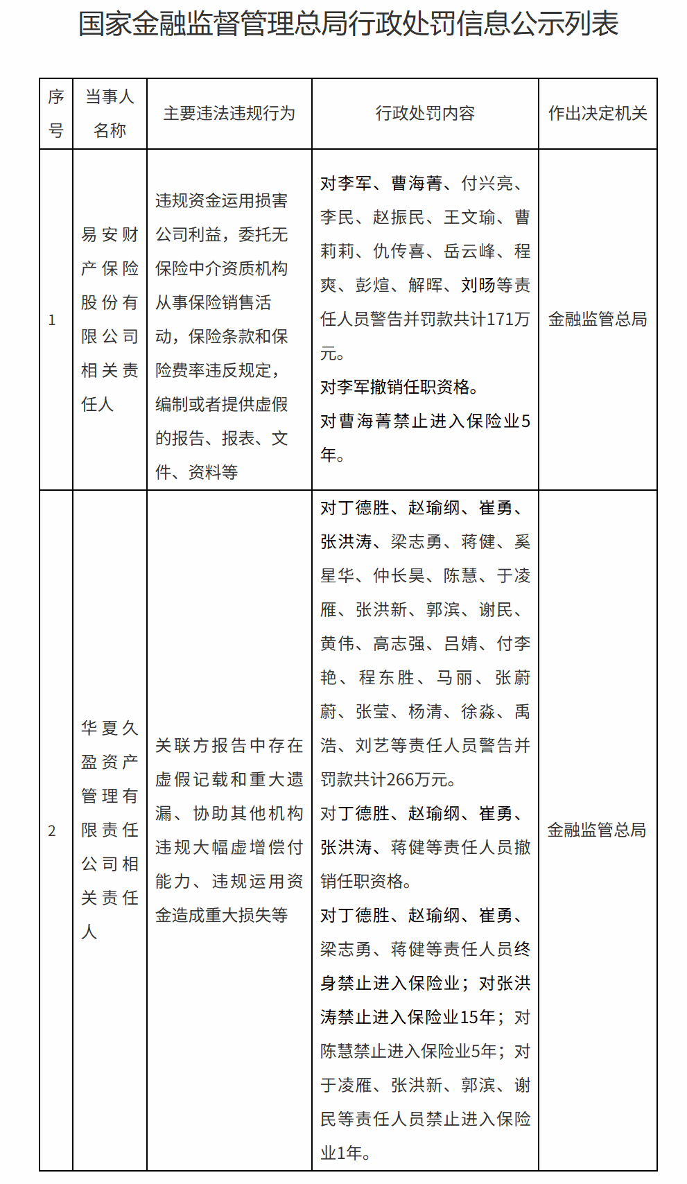 金融监管总局对郭予丰、赵兴桐、高焕利、张祥祯、马淑伟等责任人员撤销任职资格;对郭予丰、高焕利、奚星华、王浩终身禁止进入保险业;对赵兴桐、张祥祯、马淑伟、洪伟禁止进入保险业10年;对李先旺、王霞禁止进入保险业5年。